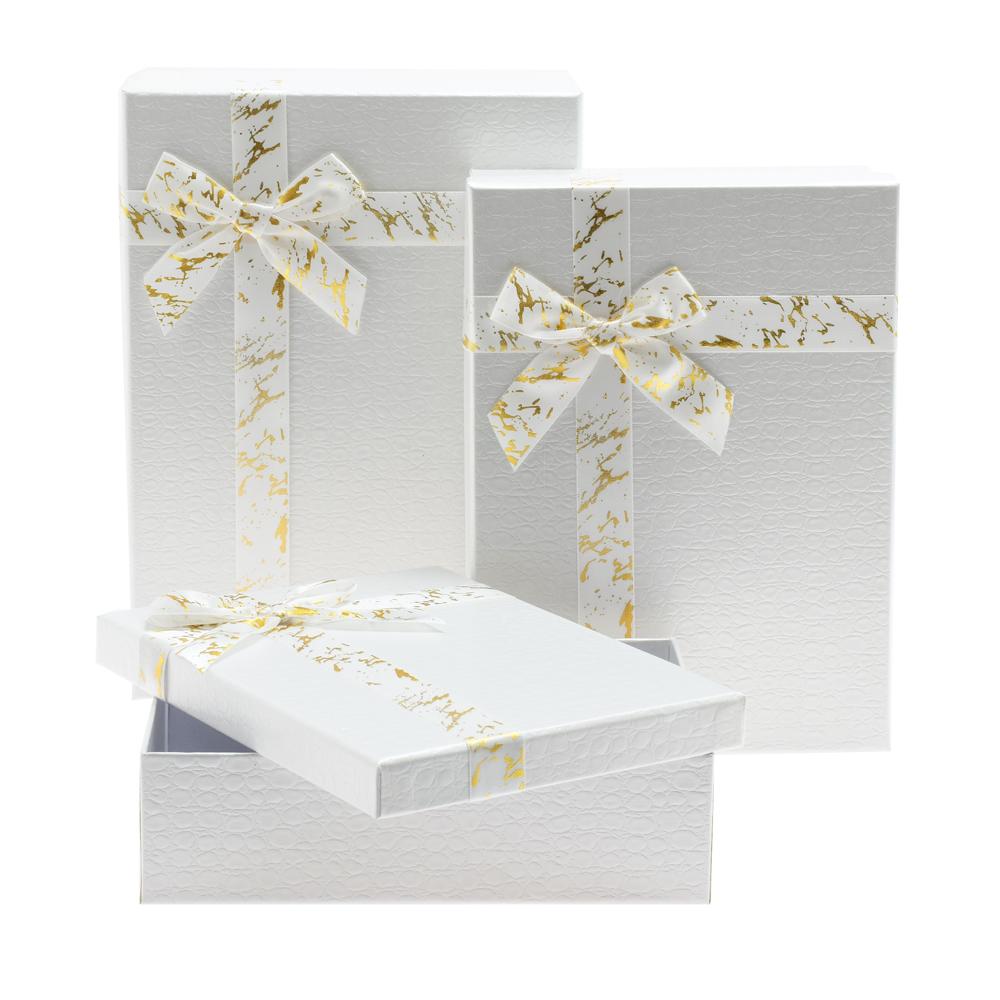 Dárková krabička v obdélníkovém tvaru je ideální pro balení dárků. Sada obsahuje tři různé velikosti, které jsou praktické a elegantní. Bílá barva s jemným zlatým vzorem dodává krabičkám luxusní vzhled. Mašle na vrchu přidává na atraktivitě a dělá z ní skvělý dárkový obal.