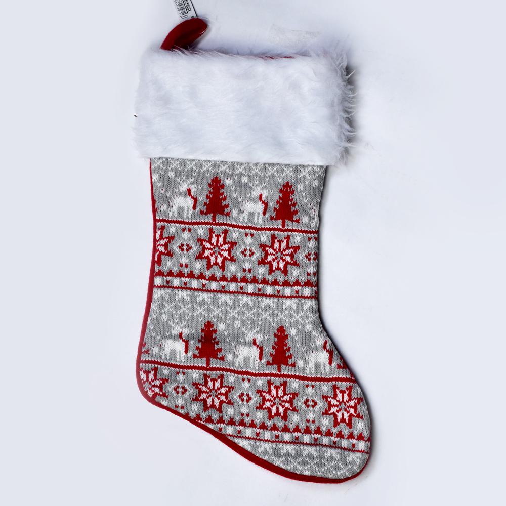 Vánočné punčochy s různými vzory v červené a šedé barvě.