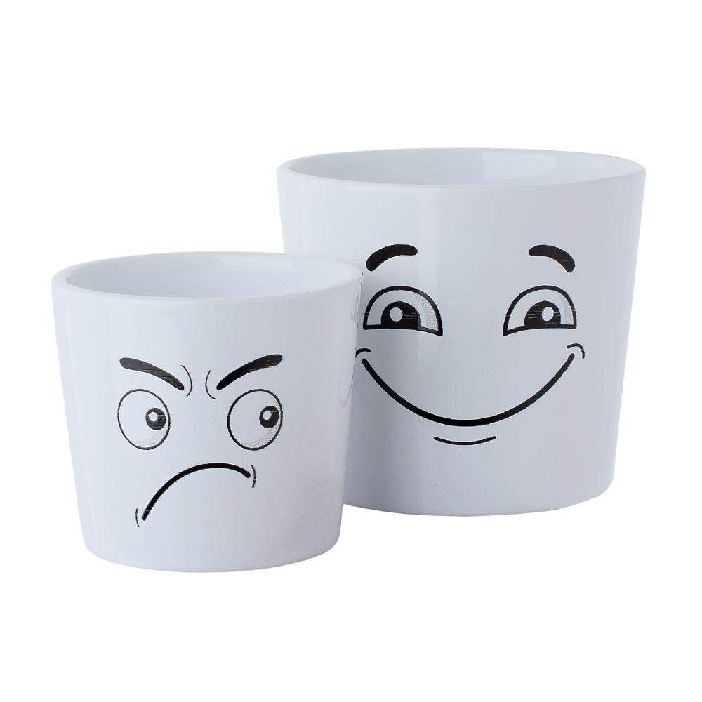 Dva keramické květináče s různými výrazy obličeje.