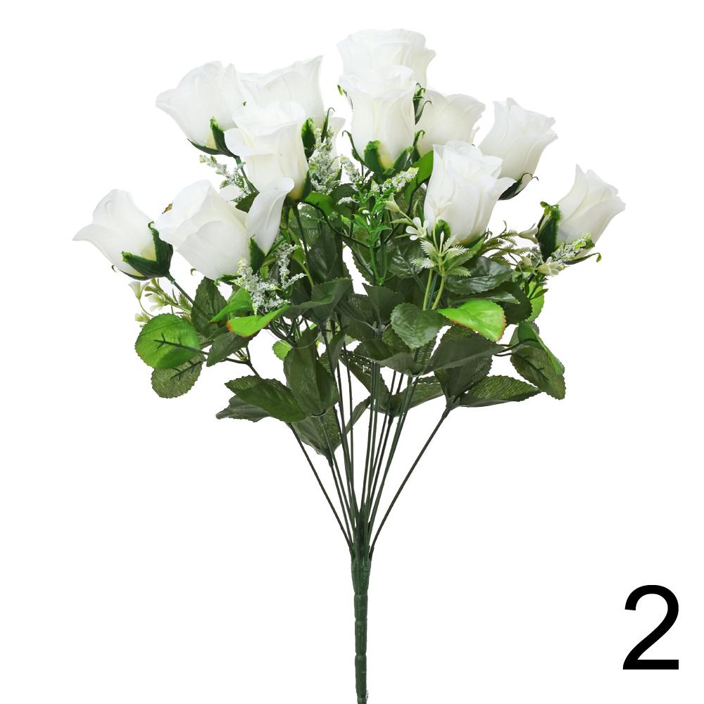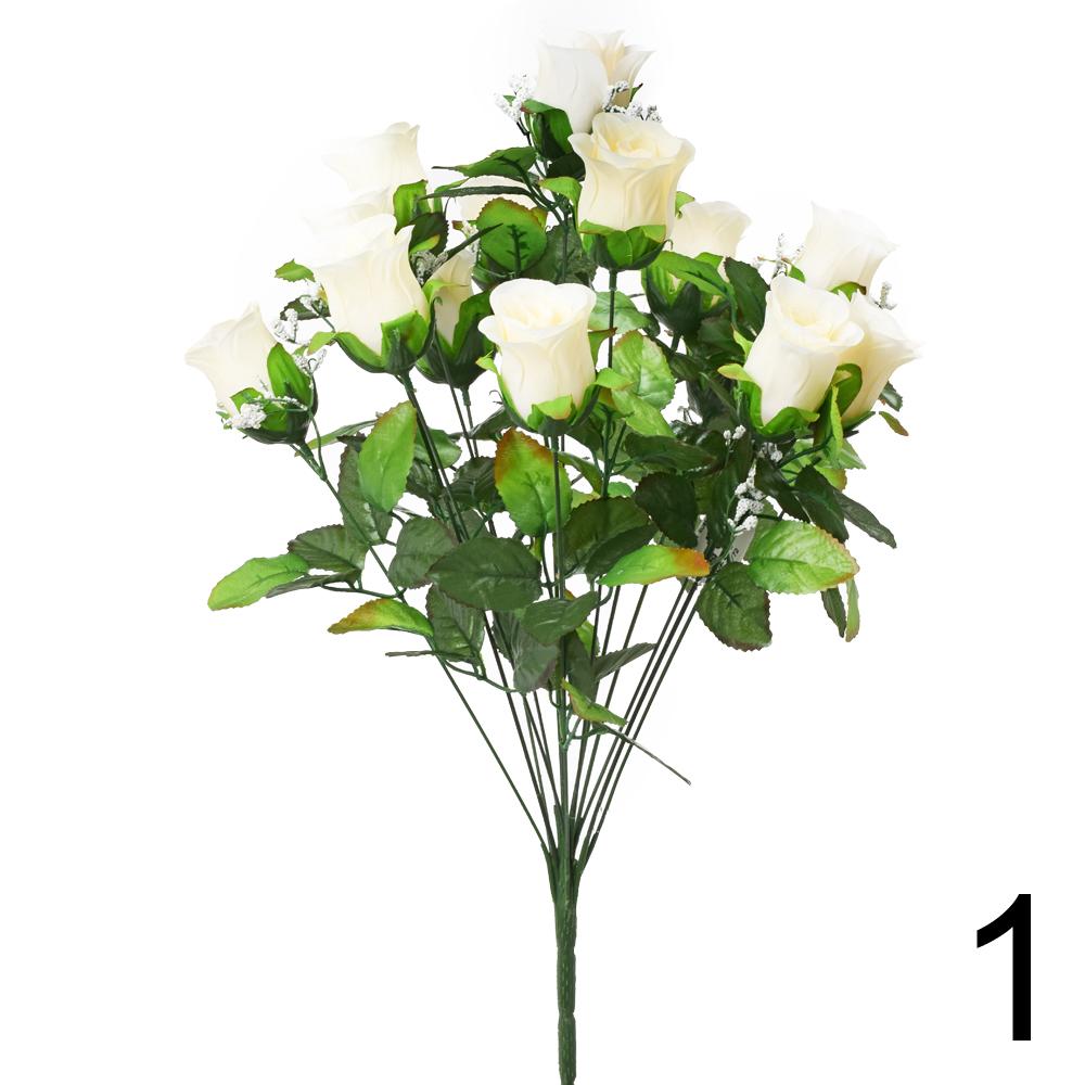 Kytice růží je vyrobena z kvalitních umělých materiálů, které zaručují dlouhou životnost. S výškou 50 cm je ideální pro dekoraci interiéru nebo exteriéru. Růže jsou v jemné bílé barvě, doplněné zelenými listy, což jim dodává přirozený vzhled. Perfektní volba pro ty, kteří chtějí mít květiny bez starostí o jejich údržbu.