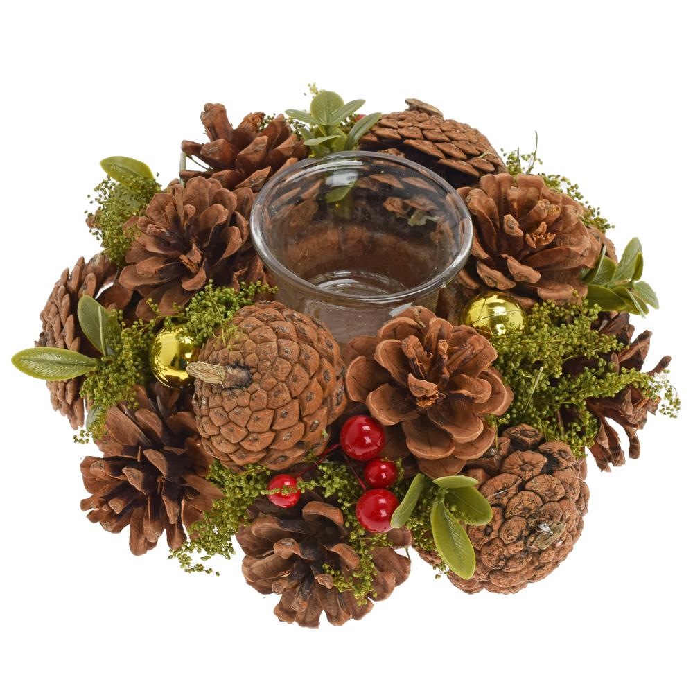 Šiškový svícen je ideální doplněk pro vaše vánoční dekorace. Obsahuje přírodní šišky, bobule a zelené prvky, které vytvářejí útulnou atmosféru. Skleněný pohárek je umístěn uprostřed, což umožňuje umístit svíčku. Rozměry svícnu jsou 18,5 cm na šířku a 8,5 cm na výšku.