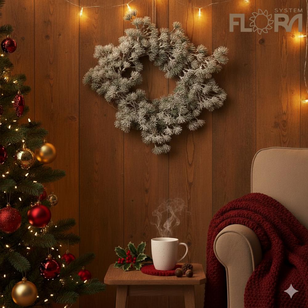 Vánoční věnec z borovice se zasněženým vzhledem, průměr 45 cm.